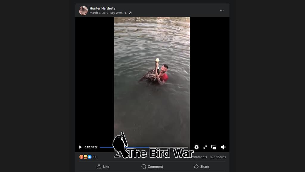 In a video posted to the man’s Facebook page, William Hunter Hardesty can be seen peering over the edge of the water before jumping in and giving the pelican a unrequited hug. The brown pelican took a nip at Hardesty and flew away unharmed.